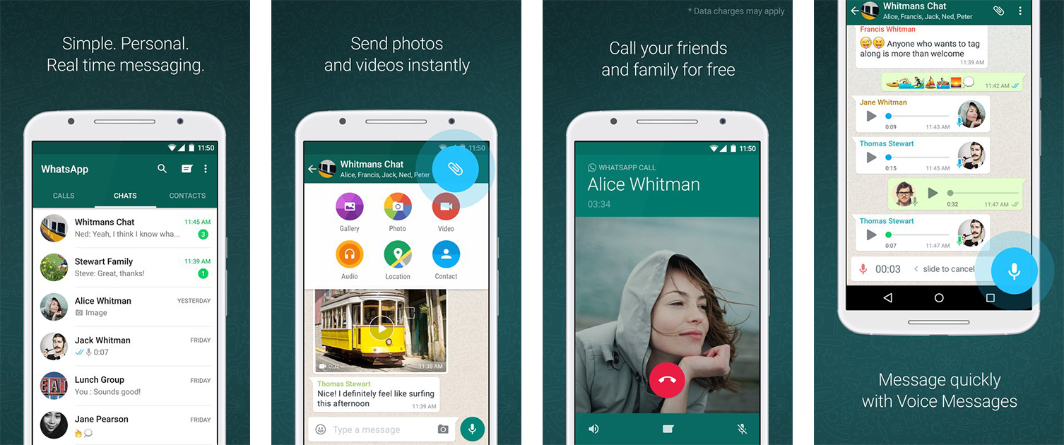 Fastest way to get started. WhatsApp uses your phone’s Internet connection (4G/3G/2G/EDGE or Wi-Fi, as available) to message and call friends and family. Switch from SMS to WhatsApp to send and receive messages, calls, photos, videos, and Voice Messages. First year FREE!